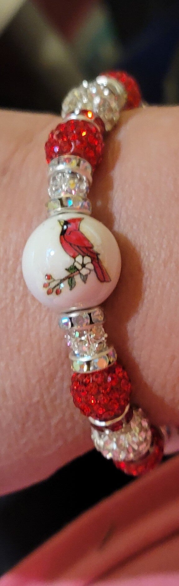 This is a beautiful and unique stretch bracelet featuring a mix of sparkling and elegant beads. The centerpiece of the design is two large, polished white beads, each adorned with a vibrant hand-painted cardinal perched on a branch. These artistic beads are set off by shimmering red rhinestone-studded beads and luminous clear crystal beads of varying shapes.