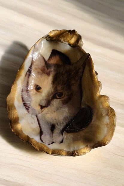 Celebrate your feline friend with this handcrafted oyster shell, featuring a cherished cat photo sealed with polyurethane and accented with hand-painted gold edges. Whether used as a tribute, display piece, or heartfelt gift, this shell turns memories into art. A purr-fect keepsake for any cat lover.